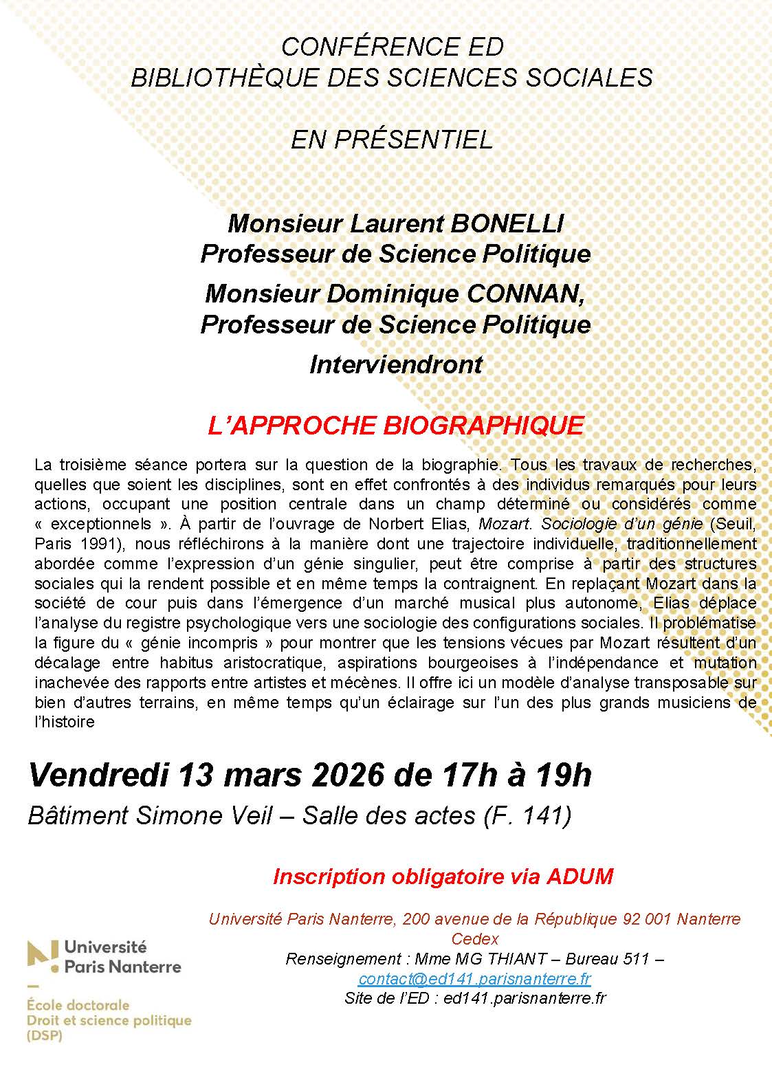 La troisième séance portera sur la question de la biographie. Tous les travaux de recherches, quelles que soient les disciplines, sont en effet confrontés à des individus remarqués pour leurs actions, occupant une position centrale dans un champ déterminé ou considérés comme « exceptionnels ». À partir de l’ouvrage de Norbert Elias, Mozart. Sociologie d’un génie (Seuil, Paris 1991), nous réfléchirons à la manière dont une trajectoire individuelle, traditionnellement abordée comme l’expression d’un génie singulier, peut être comprise à partir des structures sociales qui la rendent possible et en même temps la contraignent. En replaçant Mozart dans la société de cour puis dans l’émergence d’un marché musical plus autonome, Elias déplace l’analyse du registre psychologique vers une sociologie des configurations sociales. Il problématise la figure du « génie incompris » pour montrer que les tensions vécues par Mozart résultent d’un décalage entre habitus aristocratique, aspirations bourgeoises à l’indépendance et mutation inachevée des rapports entre artistes et mécènes. Il offre ici un modèle d’analyse transposable sur bien d’autres terrains, en même temps qu’un éclairage sur l’un des plus grands musiciens de l’histoire