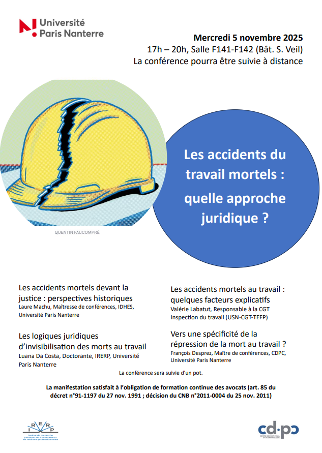 - 																	Les accidents du travail mortels : quelle approche juridique ?5 novembre 2025Conférence organisée par l’Institut de Recherche sur l’Entreprise et les Relations Professionnelles (IRERP), en collaboration avec le Centre de Droit Pénal et de Criminologie (CDPC) Lire la suite