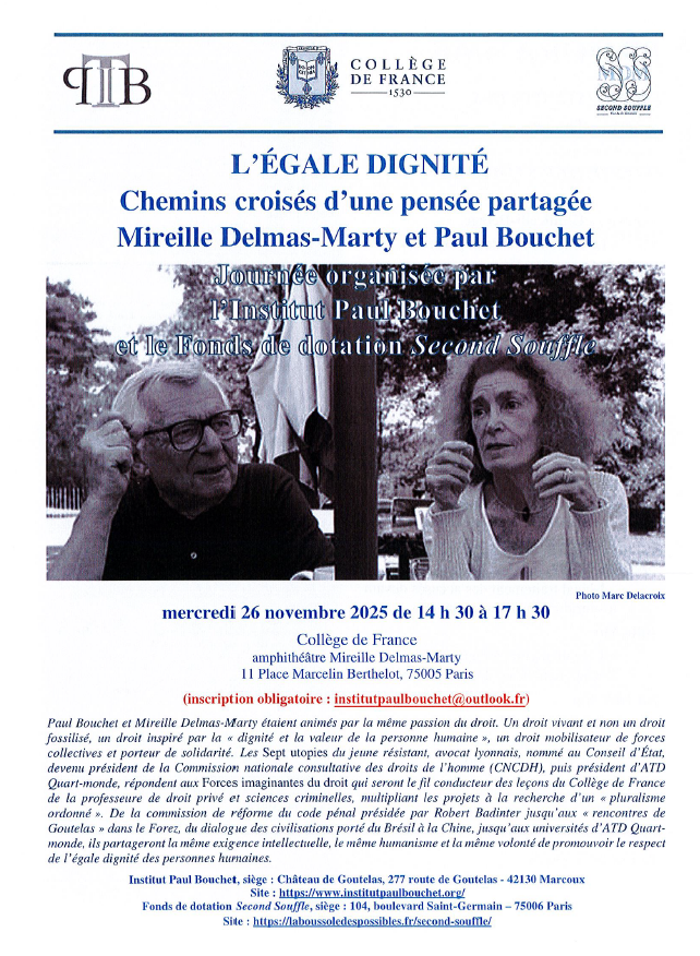 - 																	Colloque"L'ÉGALE DIGNITÉ Chemins croisés d'une pensée partagée Mireille Delmas-Marty et Paul Bouchet"26 novembre 2025HommagePaul Bouchet et Mireille Delmas-Marty étaient animés par la même passion du droit. Un droit vivant et non un droit fossilisé, un droit inspiré par la « dignité et la valeur de la personne humaine », un droit mobilisateur de forces collectives et porteur de solidarité. Lire la suite