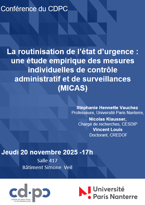 - 																	Conférence "De la normalisation de l’état d’urgence à sa routinisation ? Une étude empirique des MICAS"20 novembre 2025Analyse du contentieux généré par la mise en œuvre des mesures individuelles de contrôle administratif et de surveillance (MICAS) Lire la suite