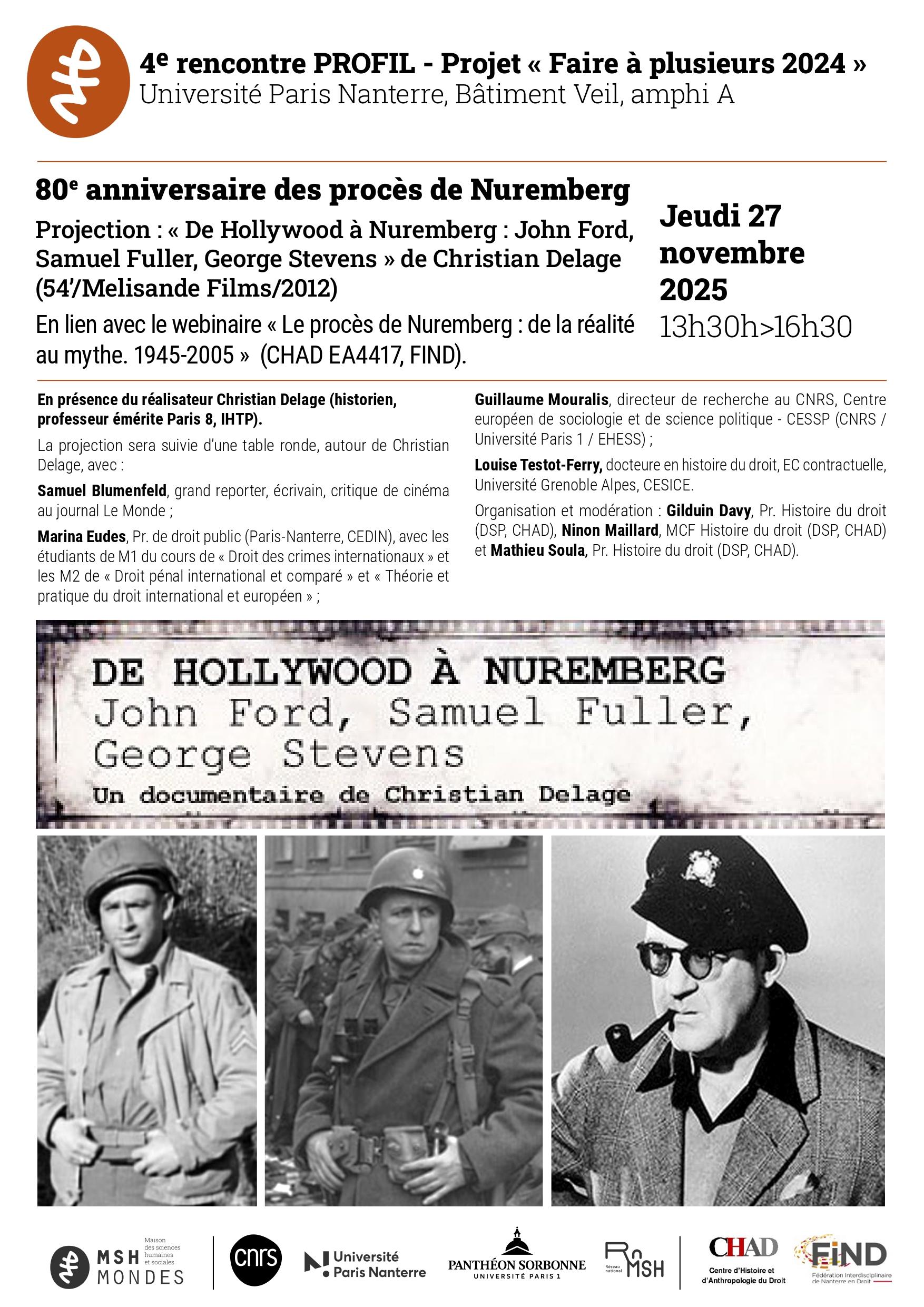 - 																	Projection du documentaire : « De Hollywood à Nuremberg : John Ford, Samuel Fuller, George Stevens27 novembre 2025Dans le cadre des 80e anniversaire des procès de nuremberg, venez assister à la projection du documentaire "De Hollywood à Nuremberg" de Christian Delage, à l'Université Paris Nanterre La projection sera suivie d'un débat en présence du réalisateur. Lire la suite
