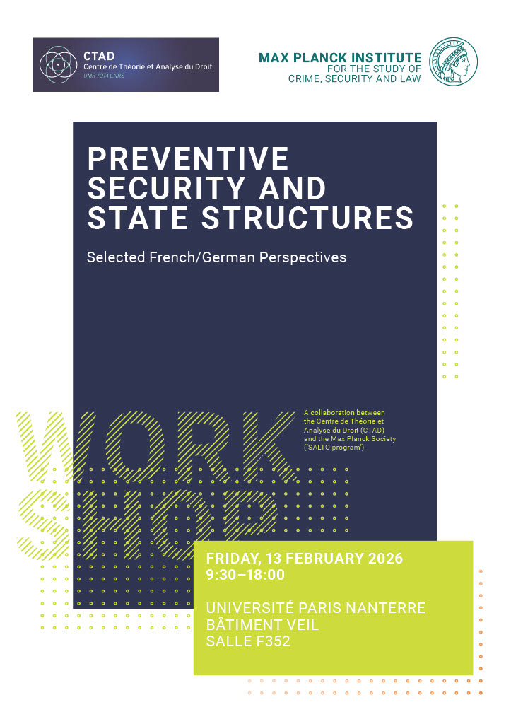 - Journée d'étude "Preventive Security and State Structures – Selected French/German Perspectives"13 février 2026Journée d'étude organisée conjointement par le CTAD et le Max Planck Institute, dans le cadre du programme SALTO. Lire la suite