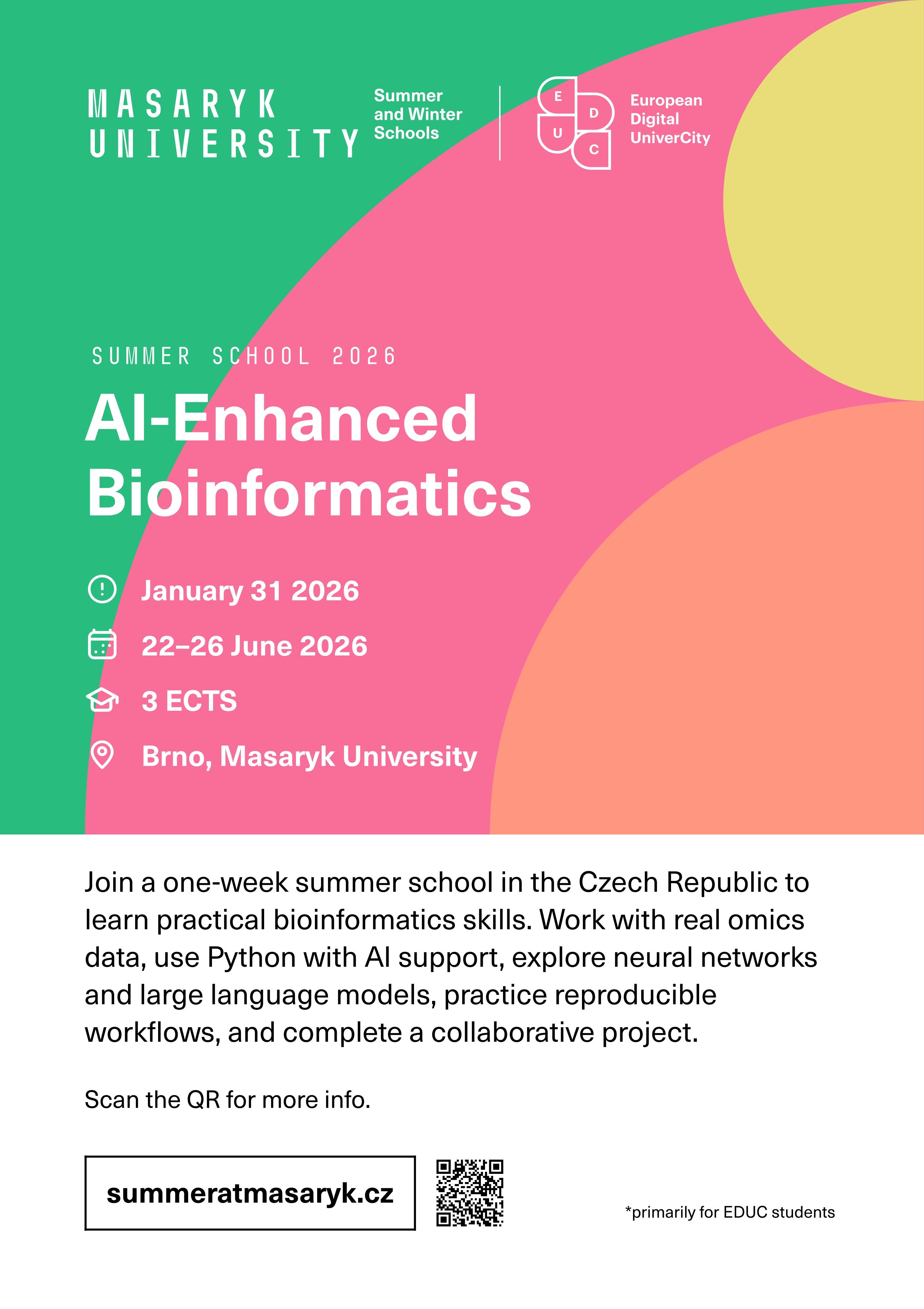 - Bioinformatique améliorée par l'IA : Exploiter les grands modèles de langage pour l'analyse des données omiques - Université de Masaryk (avril-juin 2026)