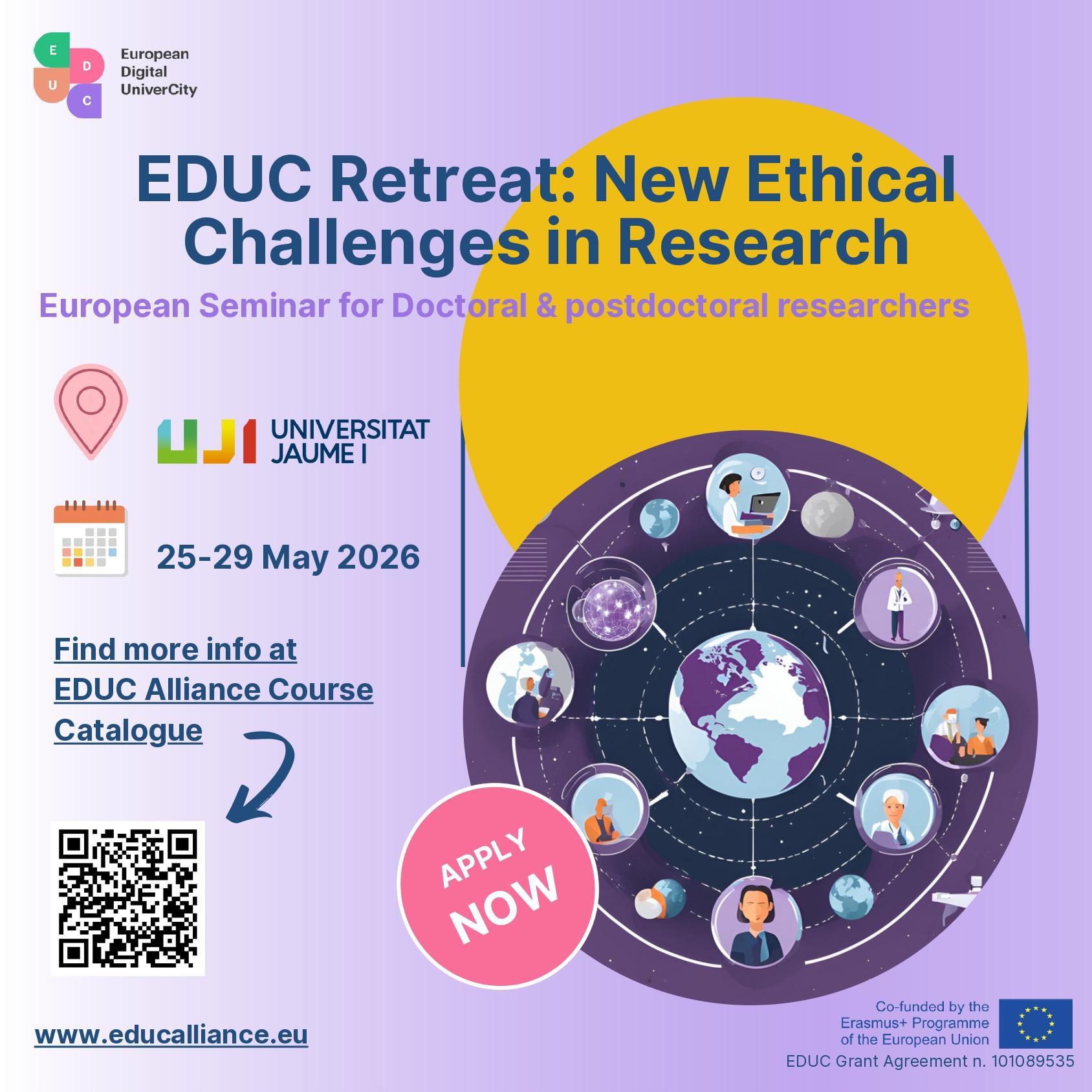 Participez au séminaire européen EDUC de 5 jours, du 25 au 29 mai 2026, à l'université Jaume I, pour doctorant·e·s, post-doctorant·e·s, et jeunes chercheur.e.s, autour des nouveaux défis de l'éthique dans la recherche.