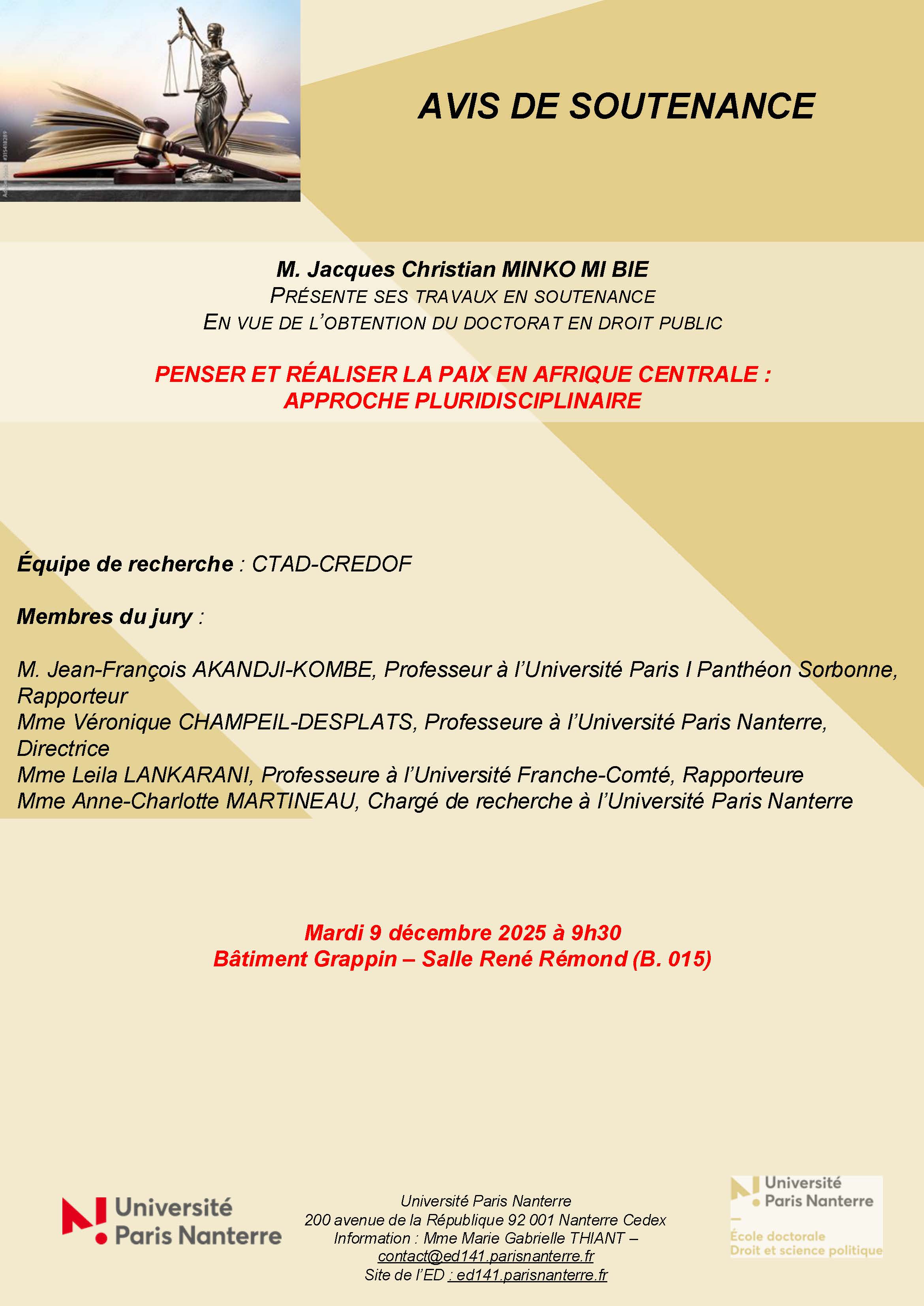 - Droit public/Thèse : Penser et réaliser la paix en Afrique centrale : approche pluridisciplinaire9 décembre 2025M. Jacques Christian MINKO MI BIE Lire la suite